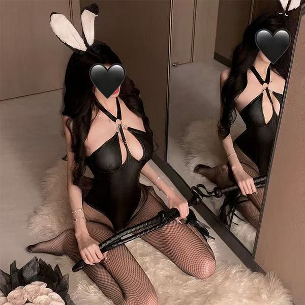 With detachable ears + open-crotch bodysuit + tail + small grid fishnet stockings